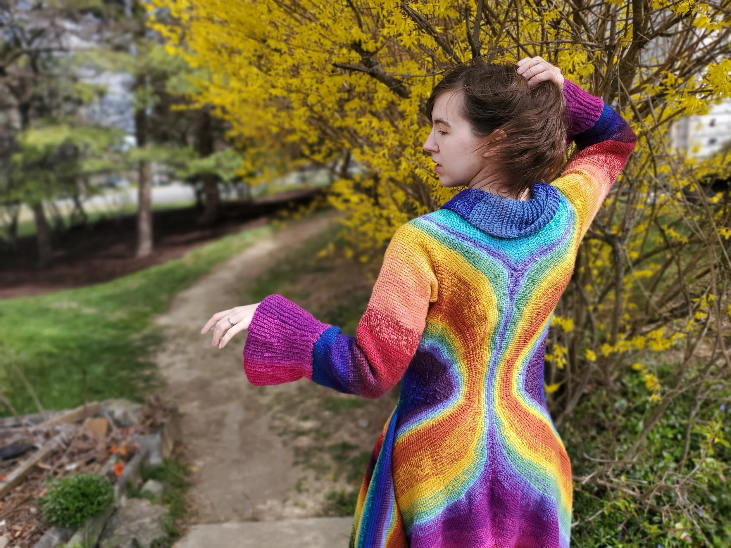 Fall in love with the art nouveau and elf-inspired Autumn Sweater, featuring an elegant square handkerchief skirt, belt detail, and wide trim that give it a unique, timeless appeal. With a beautiful color scheme that evokes the image of autumn leaves swaying in the wind against a sunset sky, this stunning piece is a true work of art. Although the pattern uses only three main stitches, the complex curves and row structures create an intricately designed garment that took over 300 hours to complete. Made of double-strand fingering weight yarn, 75% Merino Superwash wool, and 25% nylon, this piece is machine washable and tumble-dryable without losing its luxurious feel. The pattern is now available on my Etsy store, and it's adaptable to many color combinations, allowing for endless creativity. This project is showcased as the first video on my YouTube channel!